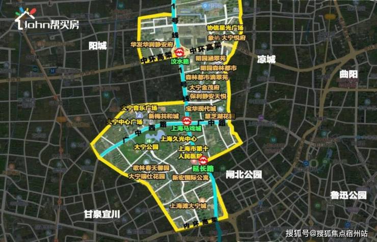 整个大宁板块呈“南北走向”的不规则形状,可以分成老城区(靠近内环高架的区域)、大宁中央区(广中西路南北两侧)、东部居住区(1号线东侧)、和市北高新区(中环高架以北)几个小板块看待;