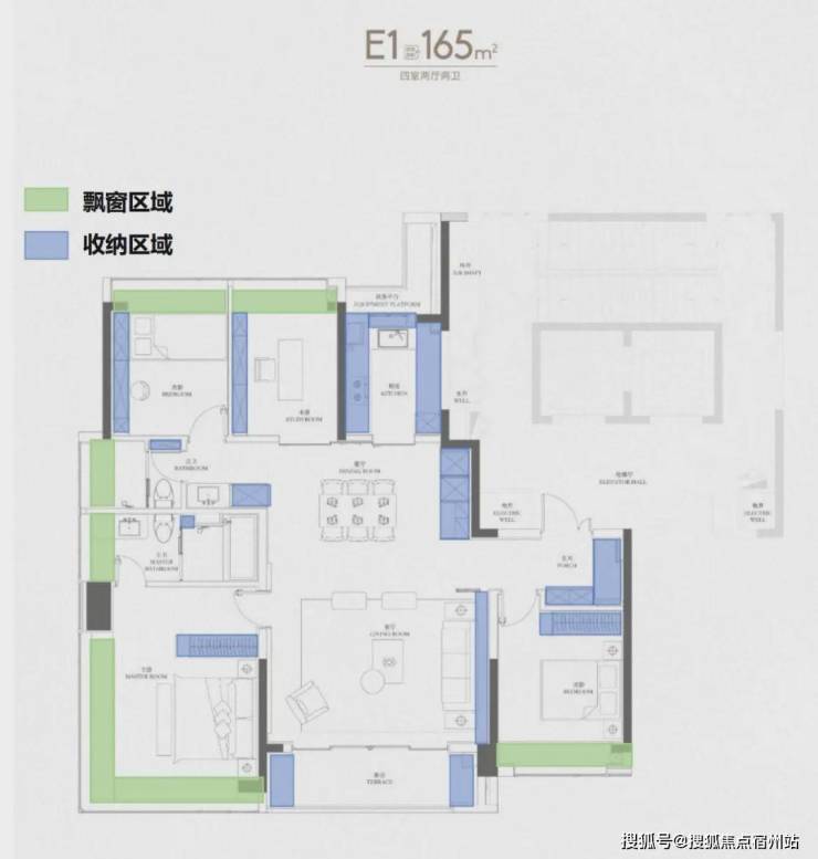 下图蓝色为收纳区域,绿色部分即飘窗区域: