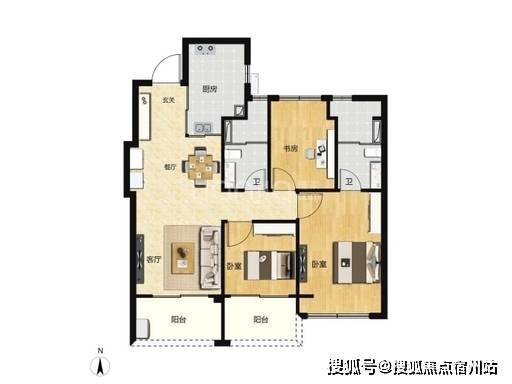 尺度数据:南北通透,三阳台 + 宽景阳台,主卧套房带独立衣帽间、明卫与观景飘窗,次卧均朝南,家庭空间分区合理,满足三代同堂或二胎家庭需求。