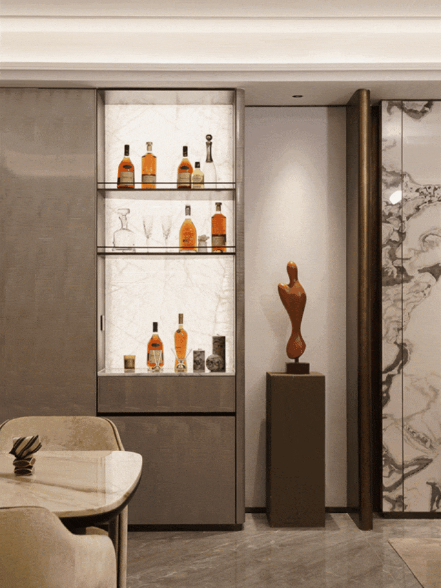 145平的大户型,入户就是一组800库,约80厘米进深的储藏空间。✅✅中建壹品·外滩源著售楼处电话:400-8824-258✅✅酒柜以及对面转角处的一套餐边柜,也是交付标准。