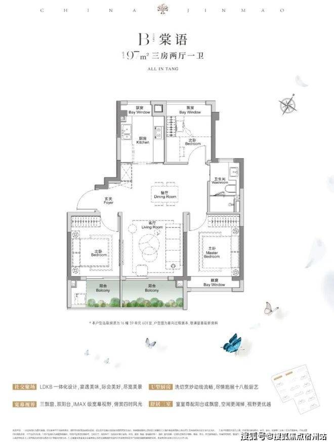 先来看下97㎡样板房,三房一卫飞机户型, 三开间朝南 搭配“ 3个飘窗+双阳台系统 ”,不管是采光、视野、通风、私密性,还是实用性都十分出色。