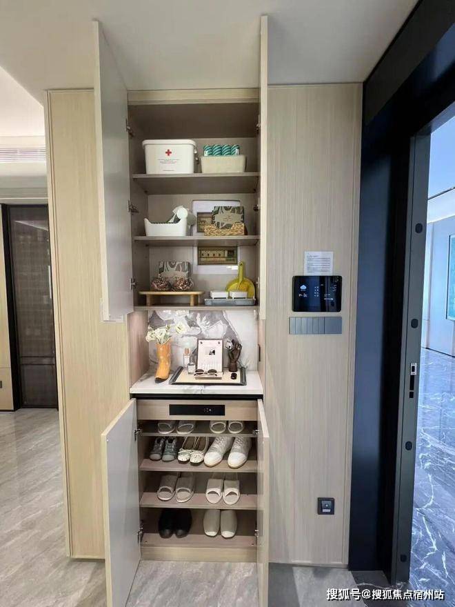 入户左手边有 通顶玄关柜(不交付),内置鞋柜精灵 ,可以看到玄关内部的隔板也是高度不一,普通鞋子、高跟鞋、杂物等等,都有分区。