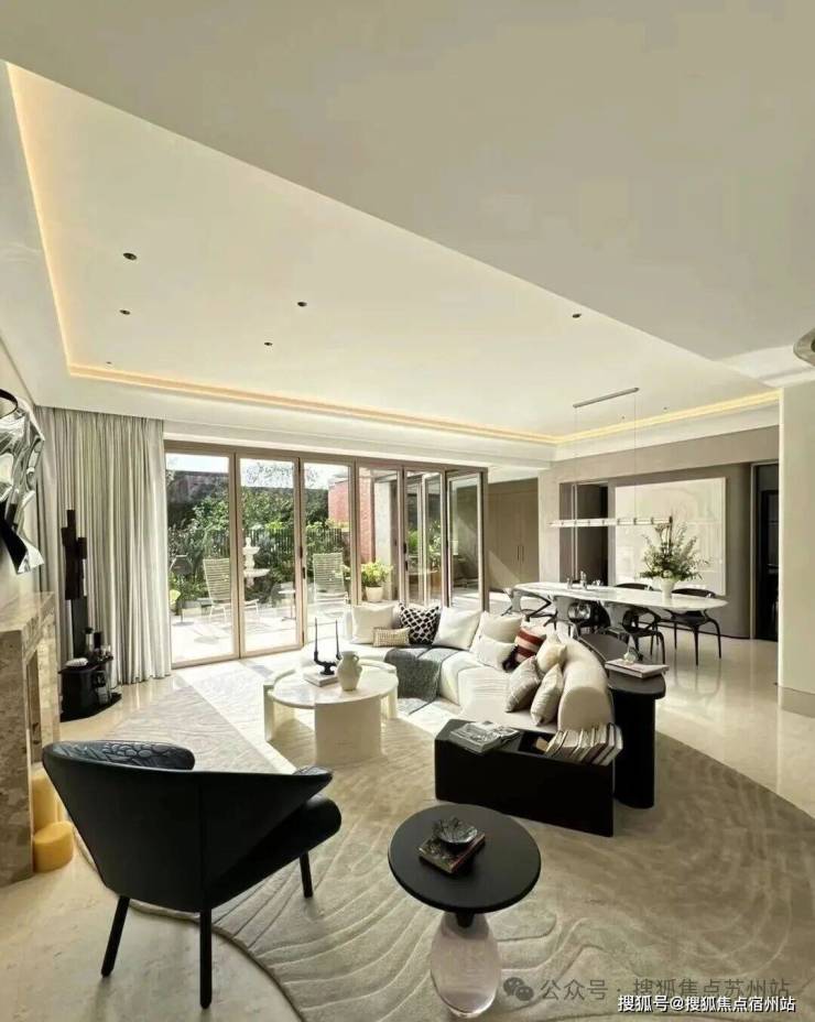 「无界空间」:客厅270度转角无柱设计,搭配落地玻璃,开阔视野将院中风景迎入日常。