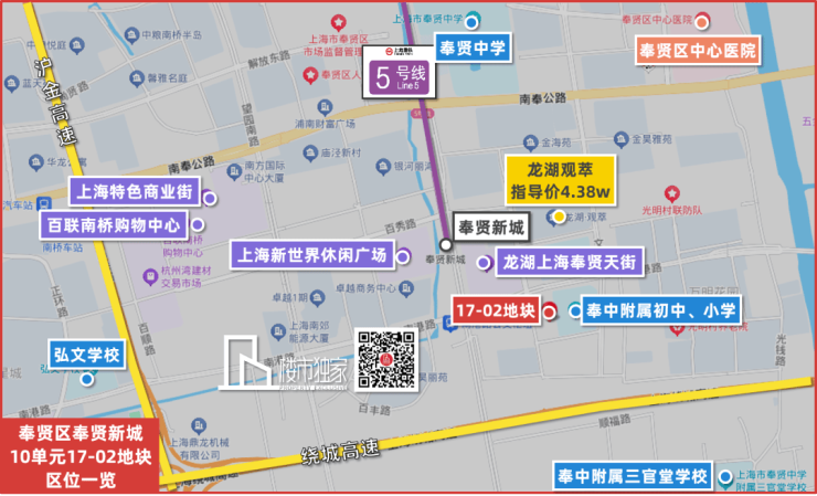 地块距离地铁5号线奉贤新城站约600米,500米范围内分布奉贤中学附属小学、奉贤中学附属初级中学、金海幼儿园,步行即可达龙湖奉贤天街,1.5公里内有百联南桥购物中心、上江南渔岸新里等商业。