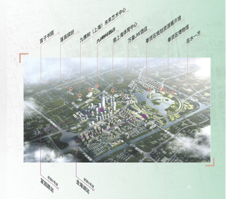 围绕金海湖打造国家级配套——奉贤区城市博物馆、奉贤城市规划馆、九棵树未来艺术中心、国妇婴奉贤院区、上中国际部奉贤校区等,拥揽优渥资源。