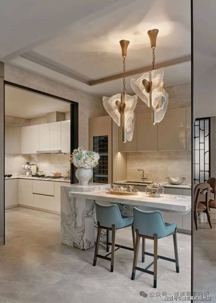 主厅核心区悬浮式定制柜体,银箔与丝绸在几何切割中构建中式基因,毕加索石材的天然裂变肌理成为天然艺术装置。瀑布吊灯以流体力学演绎东方留白,让光影在岩板表面生长出动态水墨意境。