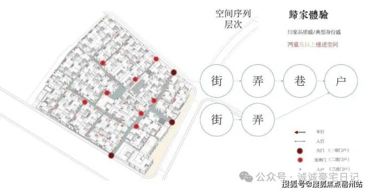 士林润园社区规划可分为蓬莱路城市公共景观以及社区内部景观两个部分,其中市政绿地衔接于上海2035城市总体规划中“蓝绿丝带”的上位条件要求,社区内部街巷空间形成空间序列形成递进的层次,将归家体验的序列依次展开,形成城市街道→入口(一级门户)→街巷→节点空间→里弄门(二级门户)→合院入户(三级门户)的方式,基本可保证大多数住户可体验到两重以上的空间递进。