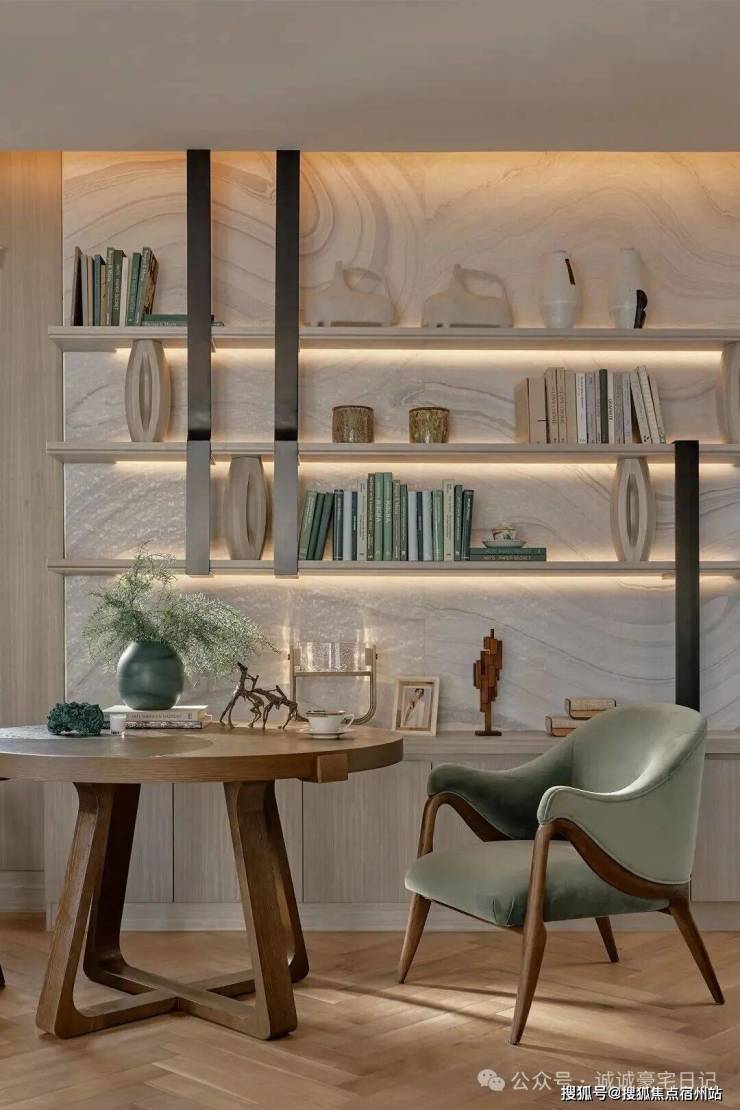 夹层被安置成了书房,安静、雅致,为了显露对生活的慰藉,像是把精神世界现实化的地方,展现修养、审美甚至家风。也如三毛在《送你一匹马》中所说:“ 许多时候,自己可能以为许多看过的书籍都成过眼烟云,不复记忆,其实他们仍是潜在的。