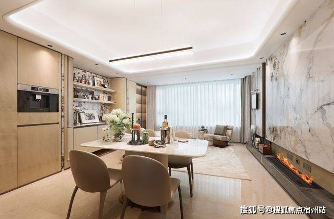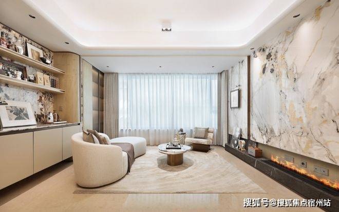 其客厅地面整体采用了奥特曼米黄奢石作为核心装饰,与整体无主灯设计相得益彰,营造出精致且富有层次感的时尚空间。
