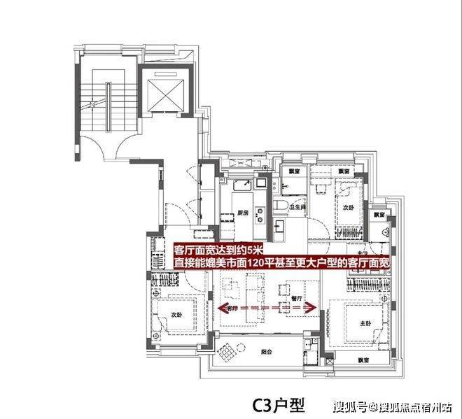 稀缺尺度的宽厅体验:客厅面宽达到约5米,这种尺度的面宽通常出现在约120㎡以上的户型,这次项目约102㎡的户型就能越级享受改善户型的待遇,可见项目在产品上是下足了功夫的。