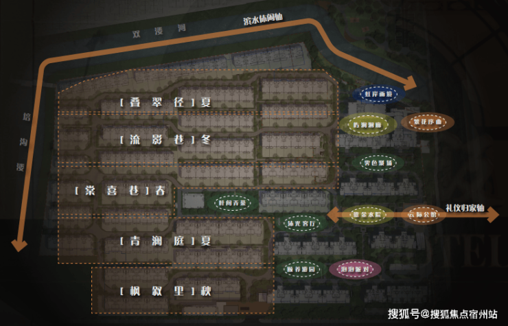 项目利用滨水环绕的特点,规划有 “十大剧场、五大主题街巷” 的景观概念,为业主带来尊崇感、仪式感兼备的归家体验。