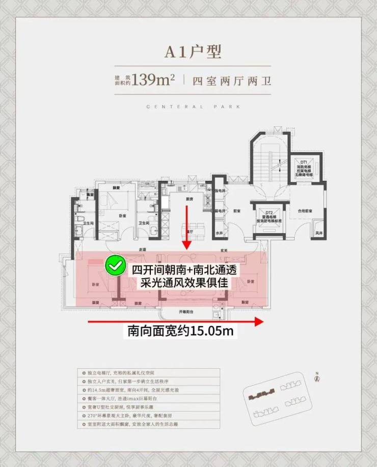 中环铂樾建面约139㎡的户型(西边套),独立电梯厅+罕见的大横厅设计,大面宽短进深,约15.05m的南向奢阔面宽,无论是采光感、尺度性都拉到了极致,享受城央豪宅级别的采光。