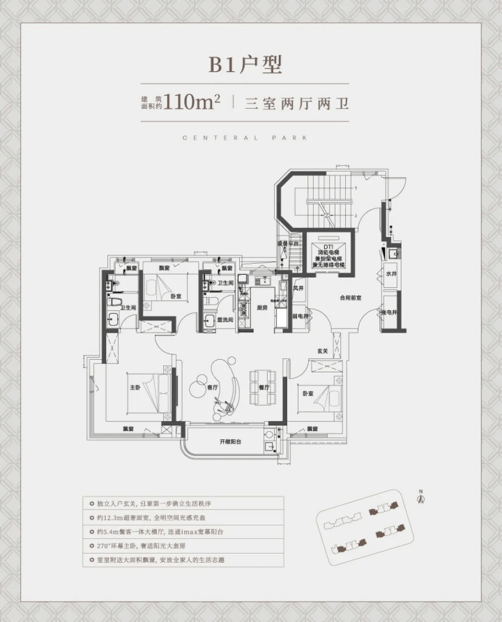 建面约110㎡中间套竖厅户型,同样也是标准的南北通透飞机户型,整体室内的采光、尺度感、通风都相当出色。非常适合一家三口、年轻夫妻的全生命周期需求!