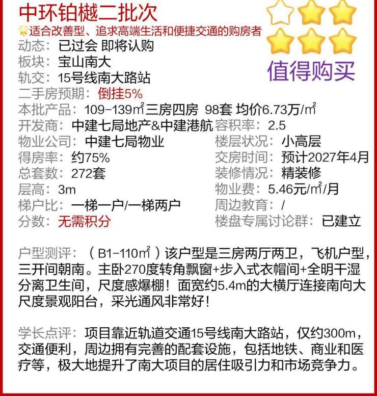 15号线&7号线双轨交护航:项目距离15号线南大路站仅约300米,就在家门口!可快速直达上海西站TOD。更临近7号线,可速达静安寺、徐家汇等核心商圈。出行通勤,无需等待。教育资源也十分充沛,项目周边分布了14所学校——8所国际蒙氏园+2所双语小学+1所科创初中+1所市重点高中+2所九年一贯制旗舰校! 其中宝山区南大实验学校、南大实验幼儿园等5所学校均已建成并投入使用;市实验性示范性高中上海师范大学附属中学宝山分校也已竣工,等待交付使用。中环铂樾售楼处电话☎:400-833-6309(预约热线)✔✔✔