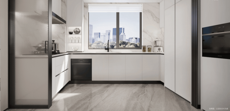还有更多细节:比如整个公共区域都是瓷砖通铺。139㎡采用简一密拼瓷砖,餐客厅、厨房通铺,尺寸达到每块900*1800mm,在视觉上形成一个整体,简约大气;