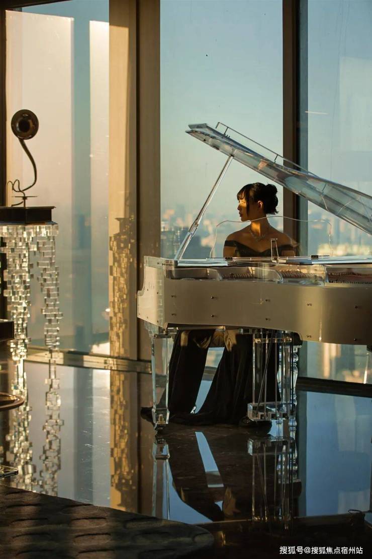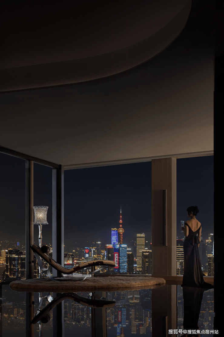 走道端处香槟色金属雕塑,形类城市高楼,又若恋人彼此依偎;全采光套房拥揽白日上海黄浦的忙碌、繁华,也收藏夜晚灯火阑珊的宁静、美好。