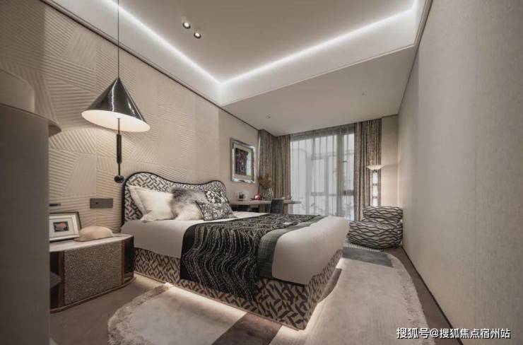 即便放了双人床、两个床头柜、一个收纳柜、两个休闲座椅和茶几,空间依旧绰绰有余,尺度感惊人!