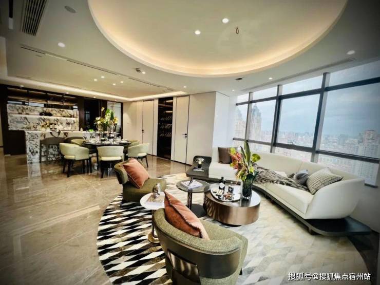 客厅270°采光面,配置弧形沙发,窗前可见上海经典三件套;