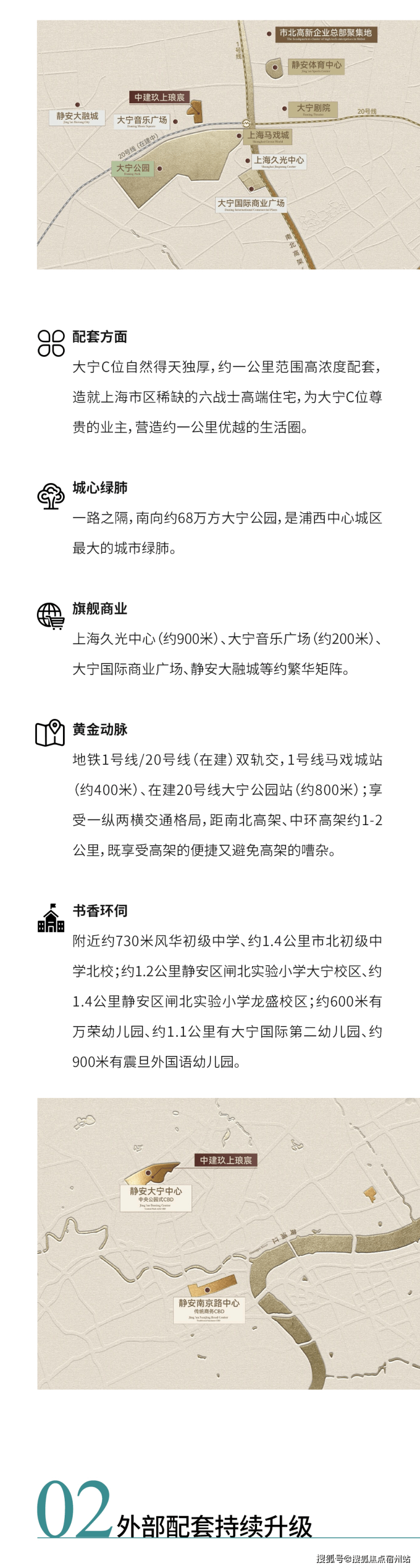 大宁的城市更新仍在升级中,在大宁公园北侧,有一片约1平方公里的低密度工业仓储用地,是静安稀有的成片待开发区域,以文创、科创为定位,助力全域中央公园CBD发展,在此轮城市更新大会上,大宁的战略一平方公里和苏河湾、东斯文里并列成为静安区三大城市更新试点地区。在项目南侧,上海马戏城旁,预期规划建设一个容纳2-3万人的顶级演艺中心,对标浦东世博梅赛德斯奔驰演艺中心 ,造型摩登,同马戏城费列罗老场馆、好时中剧场共同组成文化三件套,形成浦西文化中心,正在修建的20号线会在此预留5号出口,以后的项目周边的城市建面预计会再上一个高度,北靠CBD,南观公园及文化三件套,大宁核心地段的价值会再次拉升。