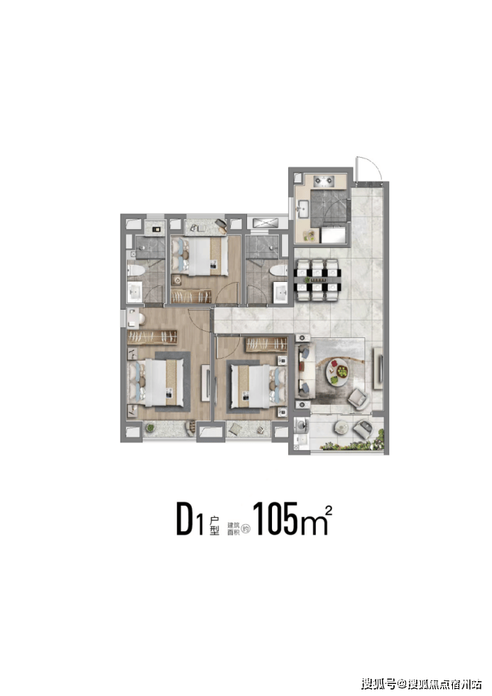 也有建面约113m²舒适性三房,南北通透;飞机户型,房间分列两侧互不打扰;卧室空间也相对更大、更舒适。