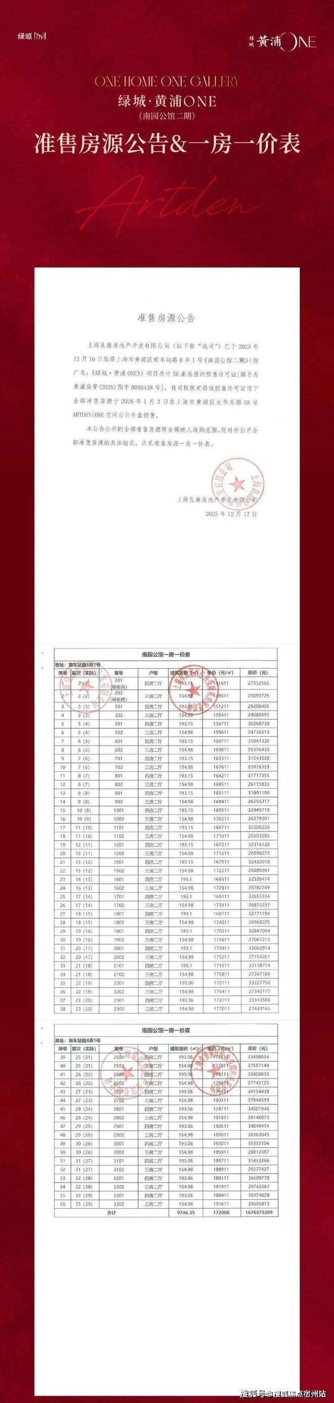 据悉【绿城黄浦ONE】二期加推建面约155-193㎡3-4房(高层),均价17.2万/㎡,总价约2300万起,收官56席,不容错过!项目接待中心持续开放中,样板间已开放!