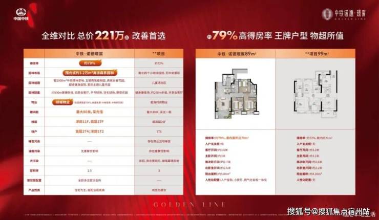 约99㎡的三室两厅两卫,三开间朝南,5飘窗设计,无空间浪费,极致细节和户型的考虑打磨。得房率约79%,套内面积达78㎡。