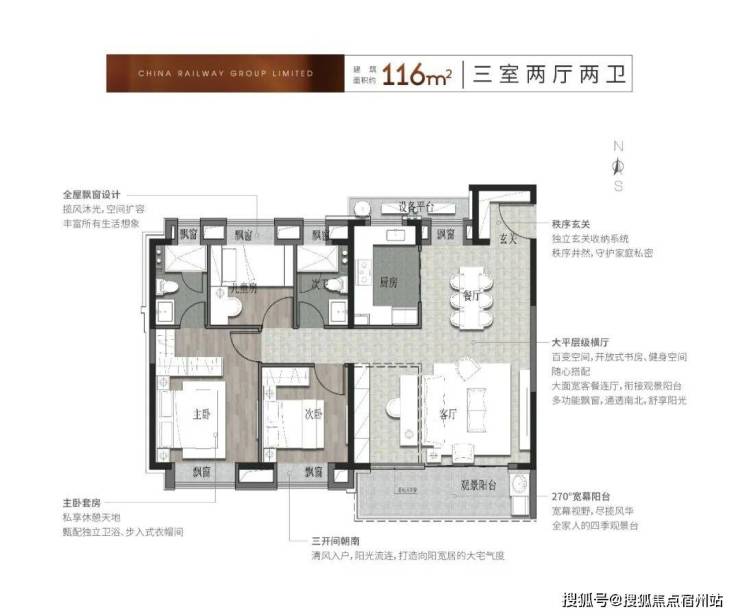 约116㎡三室两厅两卫,南向3开间,全屋6飘窗设计,约79%高得房率,套内面积约91.64㎡,空间享受奢适进阶。