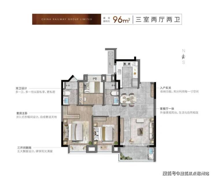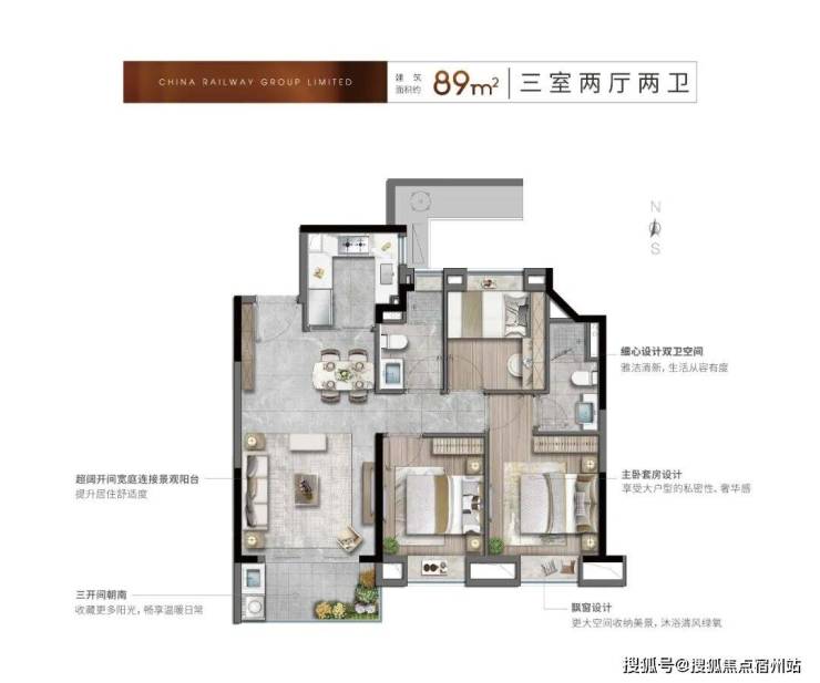 约96㎡的三室两厅两卫,三开间朝南,5飘窗设计,无空间浪费,约79%得房率,套内面积超75㎡。