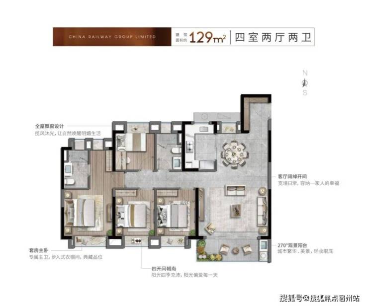 约129㎡四室两厅两卫,四开间朝南设计,拥有一个超大面积的主卧套房,约79%高得房率,套内面积约101.91㎡,得以实现真正的生活改善进阶。