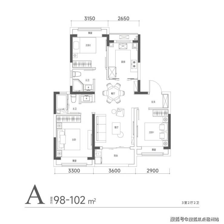 建面约100㎡是实打实3房,客厅宽度达3.6米,主房间宽达3.3米,连北面小房间也能放1.5米宽的床。