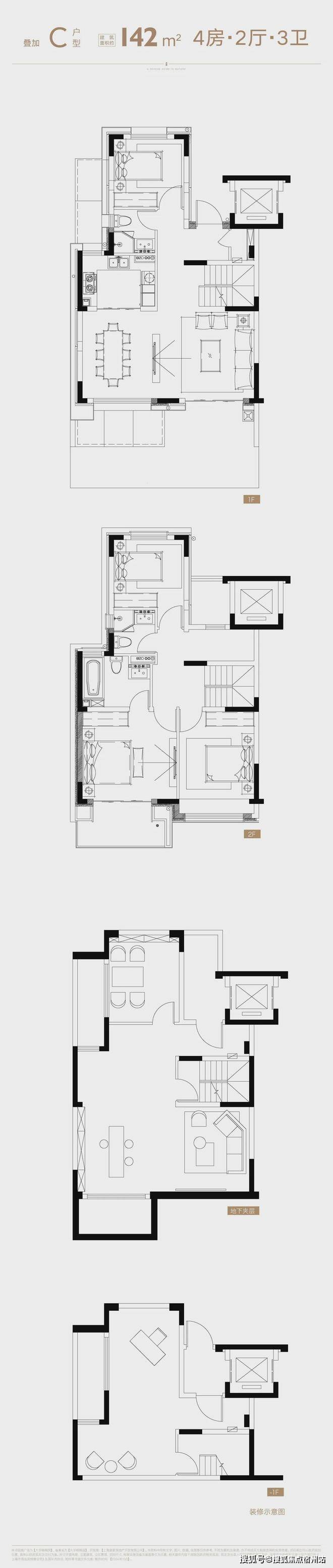 上叠户型4房2厅3卫,三层会客区,四层居住区,阳台+露台+飘窗设计,附加空间非常大,在别墅类产品中实属罕见!