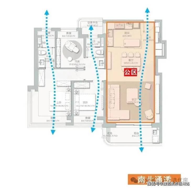 从组合平面看,这个户型是一个边套户型。在采光通风方面,户型本来就方正,再加上南北通透,就 显得更“正气” 。(如下图)