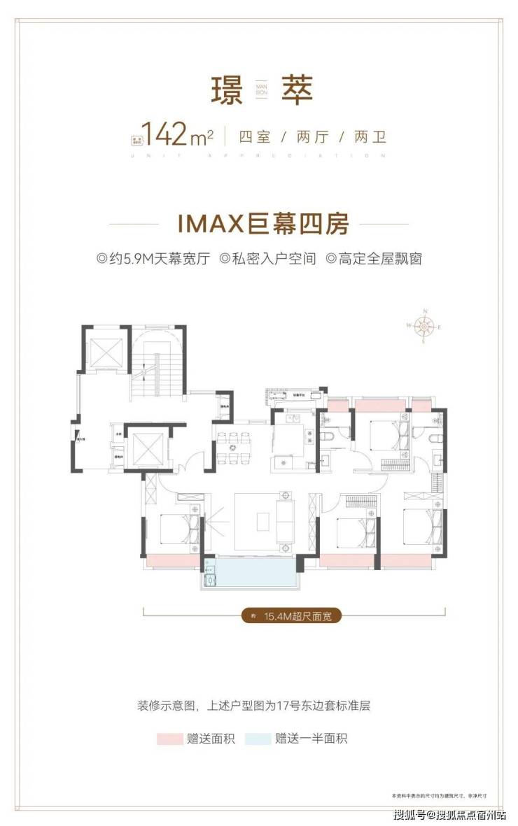 四点五个面宽朝南+约5.9m的宽厅设计, 南向面宽达到惊人的15.4m, 大宽厅 还可以打造灵动空间,老人、小孩在客厅玩游戏、练瑜伽等,营造出更多丰富的生活场景。