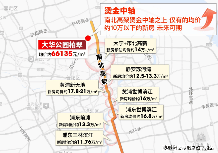 可见南北高架的能级和地位,也正因如此。 从新天地到人民广场、南京西路,从世博滨江到苏河湾,从到大宁、前滩, 上海各个时代的顶级置业区,都诞生在了南北高架的两侧。