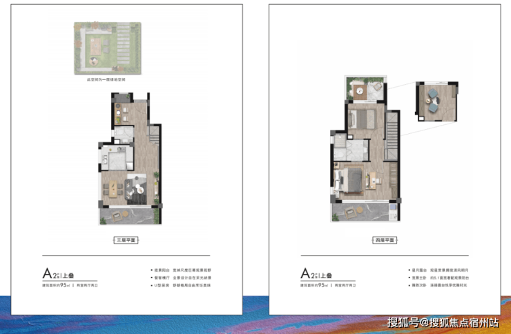 来看户型,面积段有两种—— 建面约95㎡下叠、上叠;建面约150㎡下叠、上叠 。