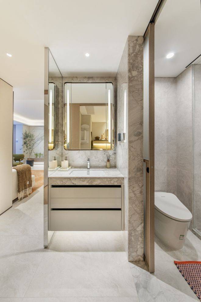 时代之城叠墅立面则采用经典三段式设计,以传统经典演绎现代时尚,超扁平极简立面镜像,配合局部天青色釉面陶板,,同样大面玻璃开窗(LOW-E玻璃),可更大程度的为业主带来宽绰视野,体验摩登生活。
