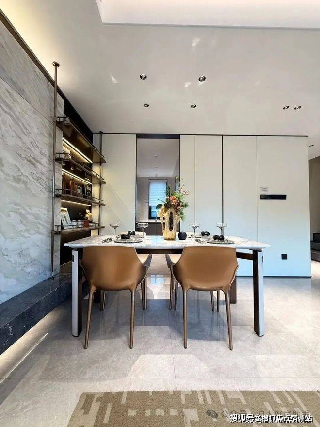 挑高 9 米的接待大厅以 "光影流动" 为主题,全画幅落地玻璃引入自然光,顶部星空铝板吊顶与地下车库 "满天星" 设计形成呼应,地面拼花勾勒出 G60 科创走廊轮廓,隐喻项目与产业带的紧密联系。沙盘区配备 "科创生活情境系统",动态演示通勤动线与配套分布,让未来生活场景直观可见。