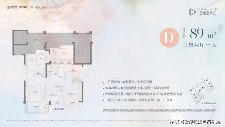 最后是D户型,不到90㎡直接3房一步到位,降低了刚需客户的上车门槛;三开间朝南+LDK一体化设计,采光性能优异,视野开阔;全卧飘窗,干湿分离卫生间,烟道外置,S墙内嵌设计,更大程度的增强空间利用率。