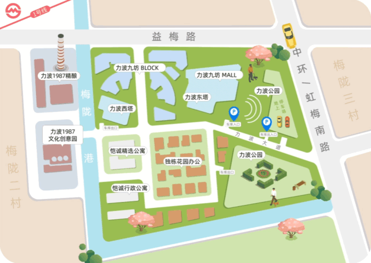 力波九坊雄踞 闵行区梅陇板块、南方商圈核心 ,地处中环内虹梅南路 379 弄,是上海主城区罕见的商业价值高地,深度融入虹桥国际开放枢纽南部版图,坐享城市发展核心红利。