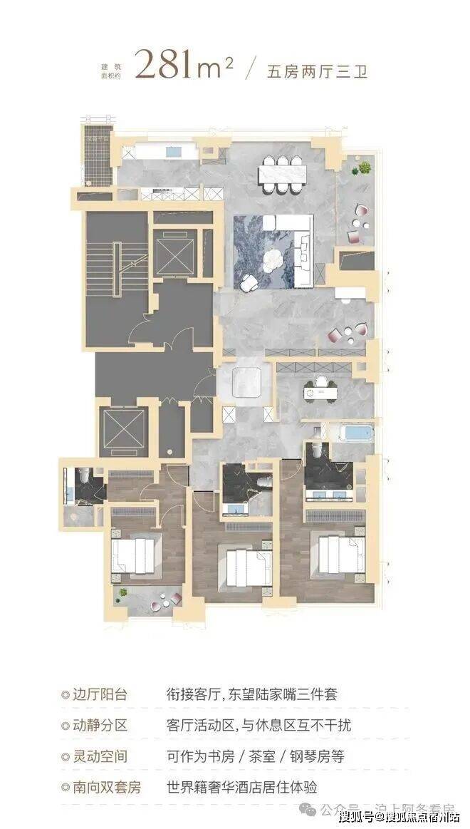 该户型只有极致景观楼层才有,南向景观面达约13.5米,无遮挡,南向两个卧室均有很好的视线通达性。