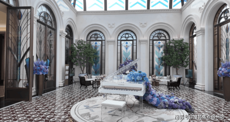 穿过大堂随后是大气的中央会客厅, 空间顶部是由彩绘玻璃组成,这样光线照射进来会呈现出更柔和的质感,同时墙面上刻有浮雕, 拱门也做了艺术化处理,与外滩的和平饭店有异曲同工的感觉,未来可以作为业主搞社区活动的场所。