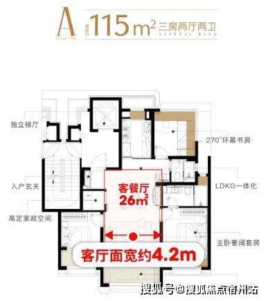 这样的设计支撑起了约26㎡的巨幕通厅,约4.2米的南向客厅开间。这样的设计,远超同面积段的常规水平,搭配全景落地窗与南向阳台,空间通透感直接拉满。餐厅区域更是能轻松放下6人圆桌,让餐厅从单纯的“吃饭区域”,升级为家庭核心社交厅。