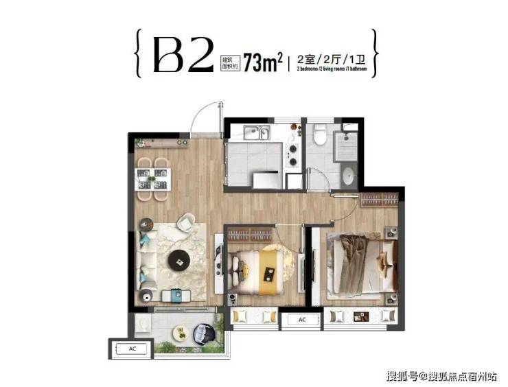 【B-B2户型建面约73㎡2房2厅1卫】