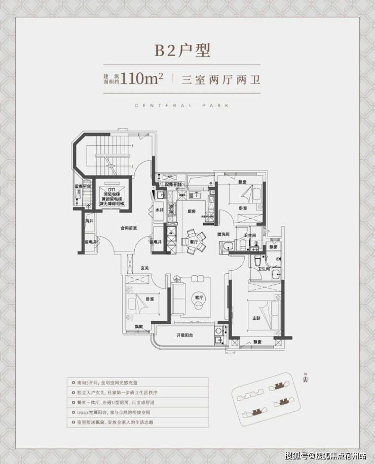 建面约110㎡中间套竖厅户型,同样也是标准的南北通透飞机户型,整体室内的采光、尺度感、通风都相当出色。非常适合一家三口、年轻夫妻的全生命周期需求!