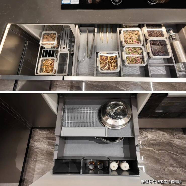 燃气灶下方做好分区的抽屉和轻松抽。台面边缘做了一定角度的斜切,这样即便滴水也不会漏至下方的柜体之中。