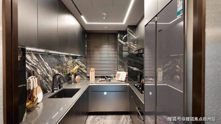 U型厨房,借了一部分飘窗因此纵深较长,但面宽相较于同面积段产品来说还是小了点。油烟机、燃气灶、烤箱和15件套洗碗机均为博世(或同等品牌);冰箱西门子双开门冰箱(或同等品牌),105㎡是单开门冰箱;水槽和龙头都是铂浪高(或同等品牌),还有康丽根(或同等品牌)净水器。