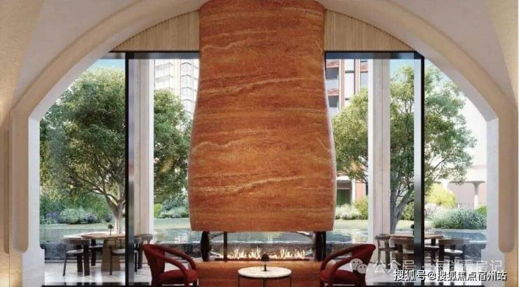 大堂位于主入口。米白色调为主,中辅以温暖红橘色调,拱形吊顶、铁艺花门和拼贴机理大理石地面交织复古与现代。枝形吊灯散发出艺术光芒,红洞石装置与室外红砖立面遥相呼应。复古橘色非围合沙发洋溢着温情,四向座席无主次之分望向室内或花园,四向皆景。