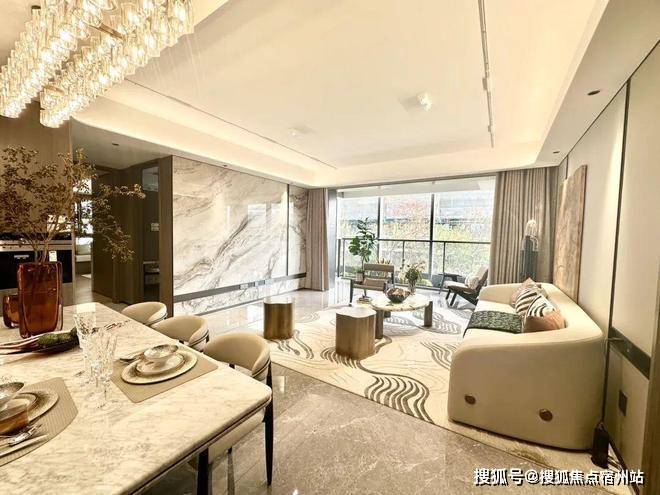 厨电配置方太的顶配系列:上方送风下方吸油烟的空调油烟机、灶蒸烤一体机;客厅配置内嵌式卡萨帝双拼冰箱;客厅大理石岩板电视背景墙面、弧形吊顶均为交付标准;