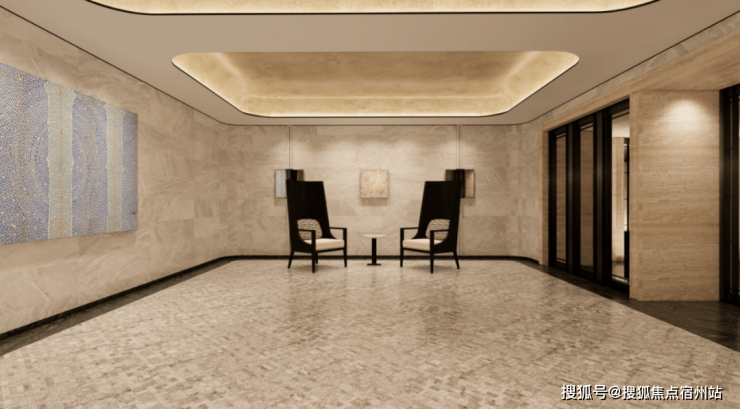 大堂前厅有别于大部分地库的设计,做了酒店式的体验。全石材的地面,顶上是一块艺术漆,周边陈列着青年艺术家的定制画作,打造艺术展览般的场景体验,业主们可以在这里放松心情,欣赏艺术,静下心来感受这处与外界不同的艺术空间。