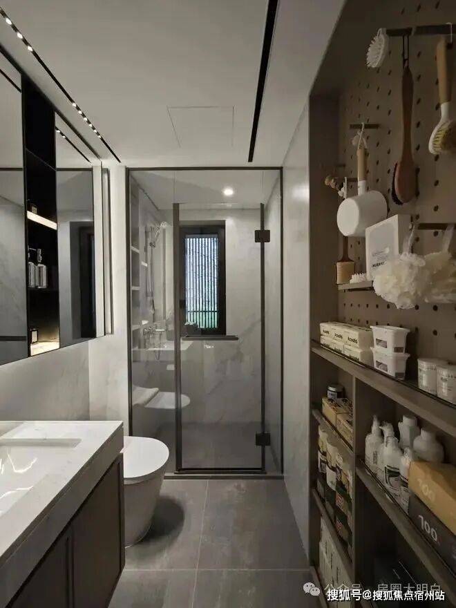 另外,在卫生间部分,项目在台盆对面做了一个墙体的向后延伸,再次做出一个超大尺寸的洞洞墙板和储物柜,原本只有镜柜的收纳空间瞬间就扩大了不止一倍。中环置地中心.望云售楼处预约电话☎:400-8377-020✅✅